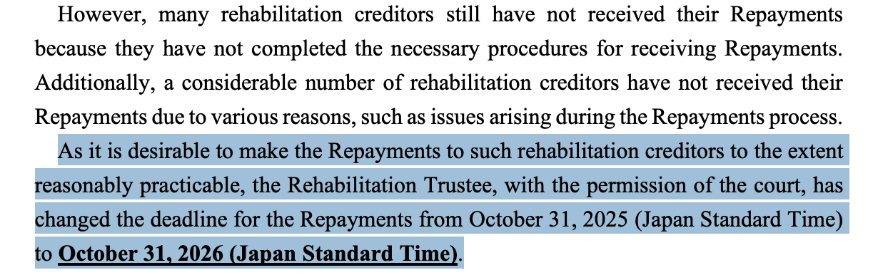 受托人强调将尽快联系尚未收到付款的个人。最初设定的2023年截止日期先被推迟至2025年,现又延至2026年。因此,Mt. Gox漫长的清算流程再次延长,2026年10月31日成为新的预期还款截止日。