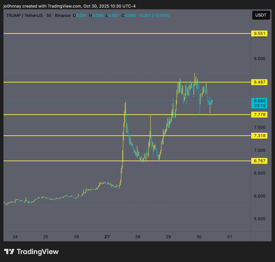 30分钟图表显示,TRUMP从6美元下方快速拉升至高见8.48美元后转入横盘,形成7.78美元支撑与8.48美元阻力的震荡区间。目前上沿已历经多次测试并保持有效,显示短线买家犹豫情绪。