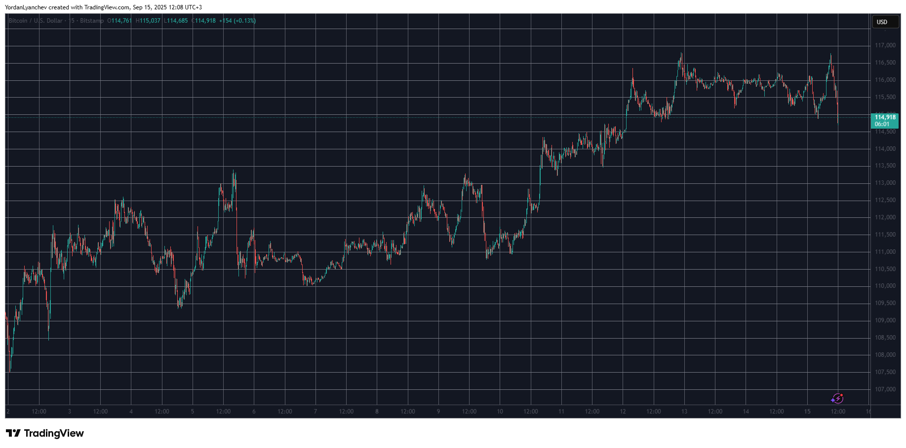 尽管在该价位遭遇阻力,周六早间仍再度上攻11.68万美元未果,整个周末基本维持在11.6万美元附近横盘。本周初比特币曾短暂逼近11.7万美元,但历史重演——这次回调使其自周五以来首次跌破11.5万美元关口。