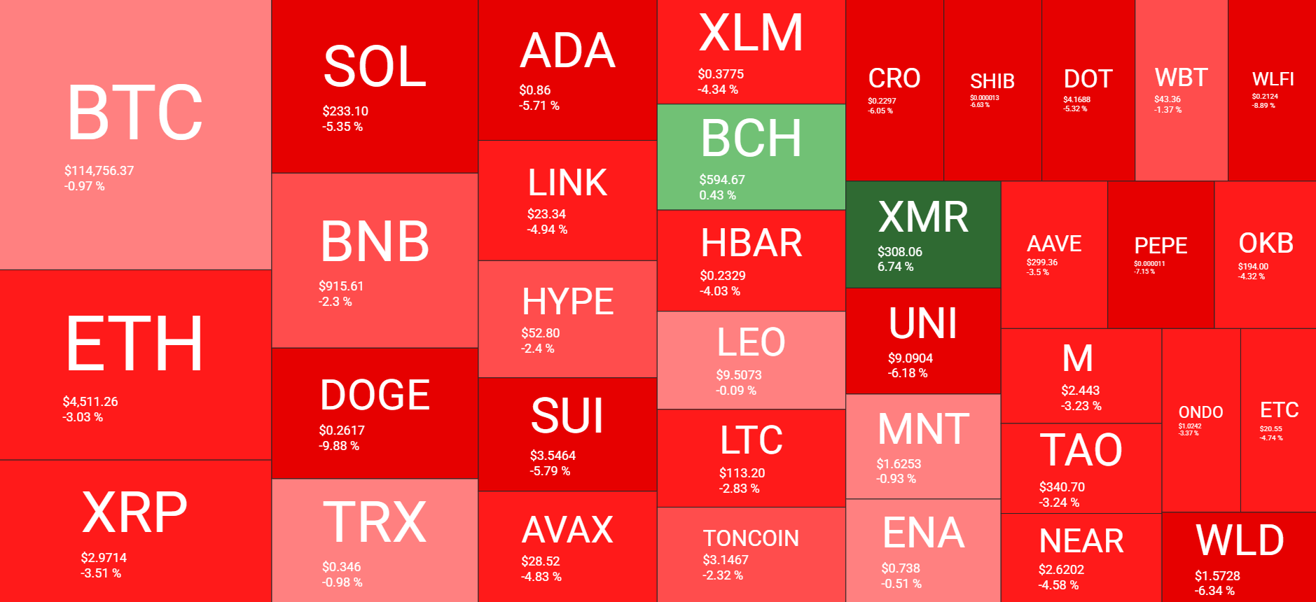 比特币在本周初迎来开门红,但空头迅速反扑,将价格压制至11.5万美元下方。山寨币随之集体跳水,其中以太坊、瑞波币跌幅尤为惨烈,狗狗币更创下惊人单日跌幅。
