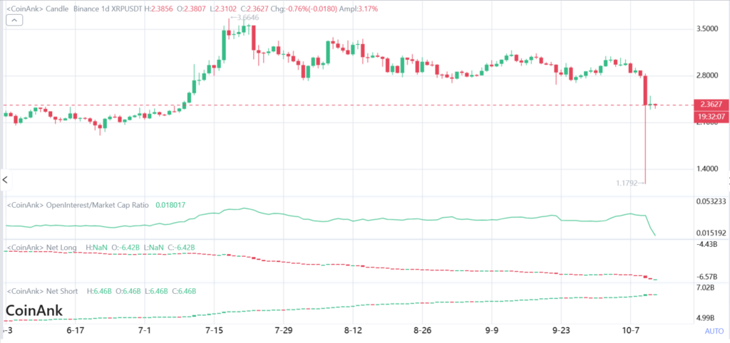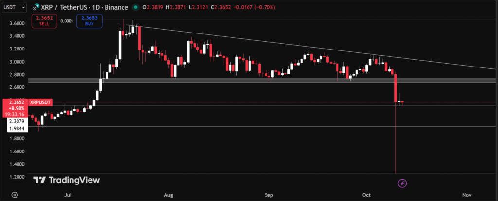 在这场风暴中,XRP的下跌同样惨烈。其价格从2.8美元附近闪崩至1.26美元,随后又快速反弹至2.3美元区间。表面看这种急速回升充满希望,但也引出一个关键问题:XRP后续将何去何从?