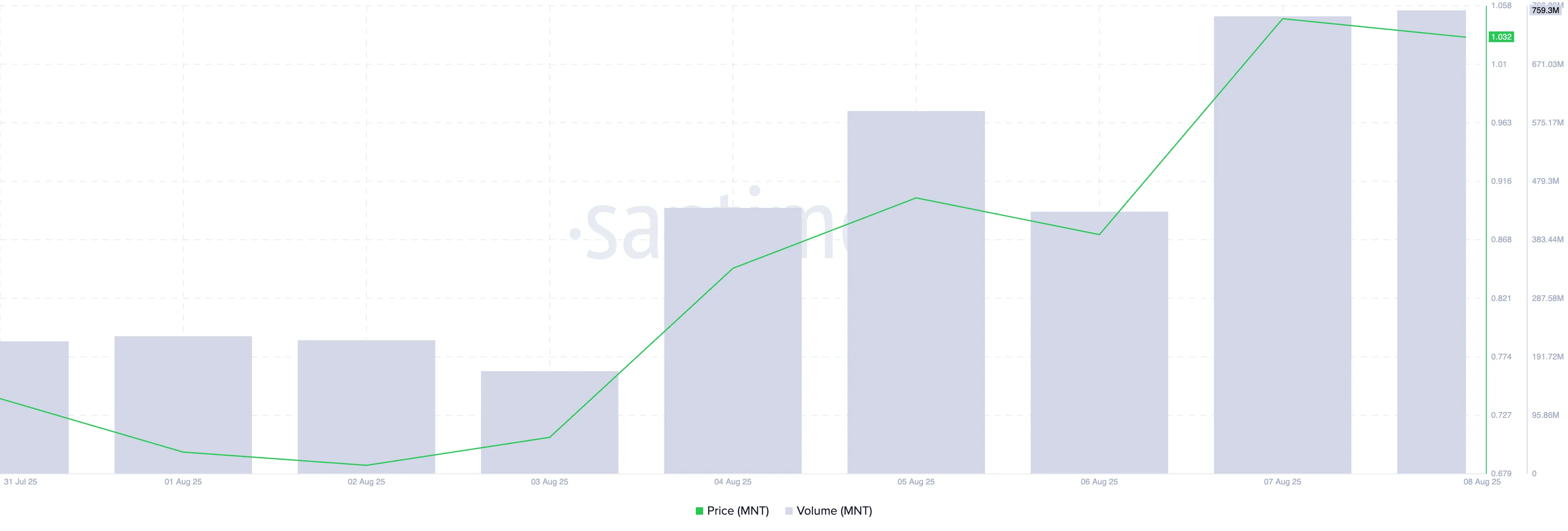 过去一周,Mantle以超45%的涨幅成为表现最亮眼的代币。Santiment数据显示,此轮价格上涨伴随着日交易量的稳步增长。截至撰稿时,MNT七日交易量激增250%,达到7.53亿美元。