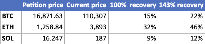 FTX债权人代表Sunil明确澄清:实际赔付率介于9%-46%之间,所谓143%赔付纯属误读。尽管多数山寨币价格已大幅回升,但现金赔付仍基于2022年价格基准。虽然关于实物赔付存在争议,但法院最终未予批准。这意味着即便名义赔付率达143%,债权人仍无法完整重建其加密资产组合。