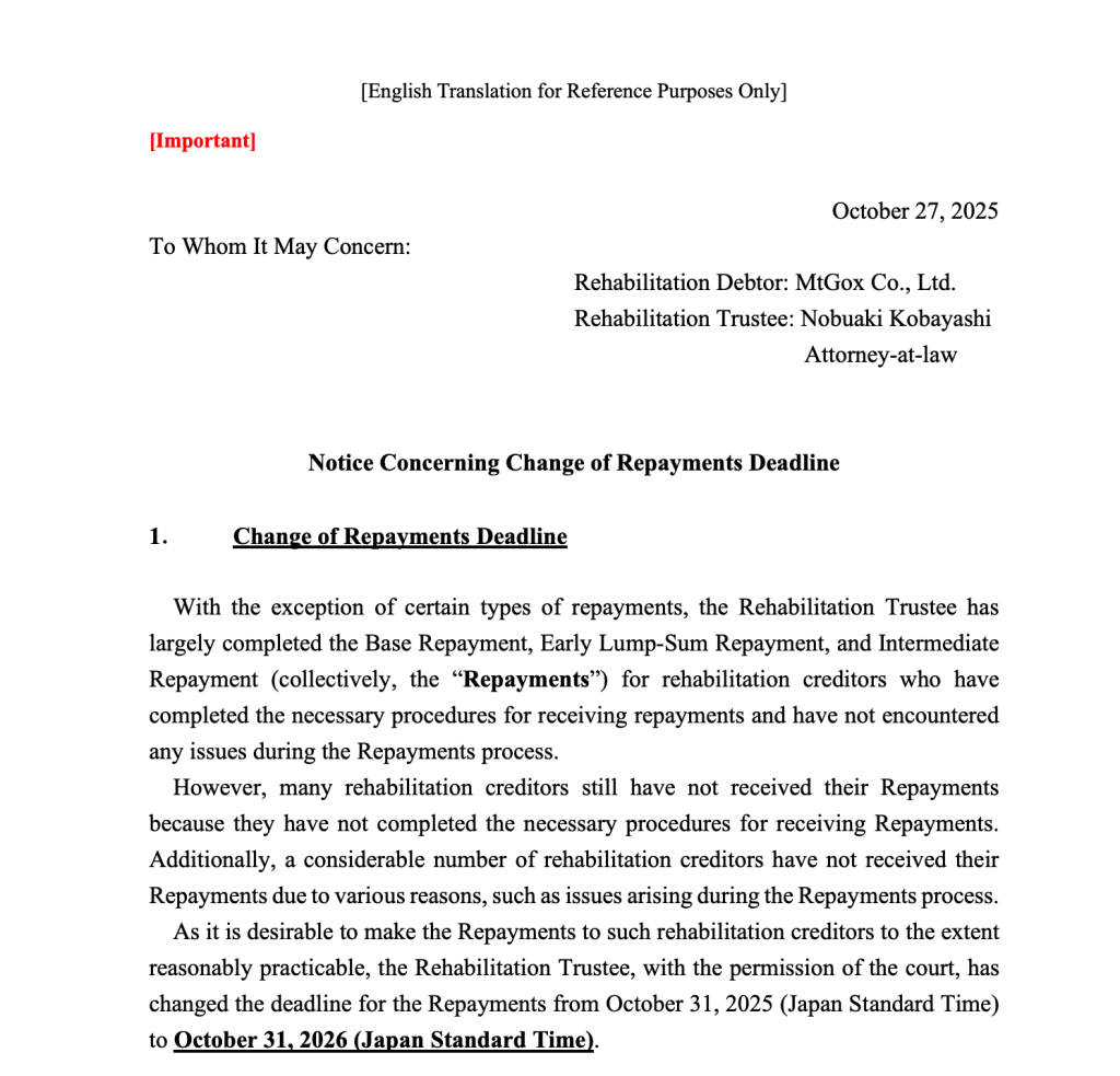 Mt. Gox将债权人还款期限延长一年至2026年10月31日。