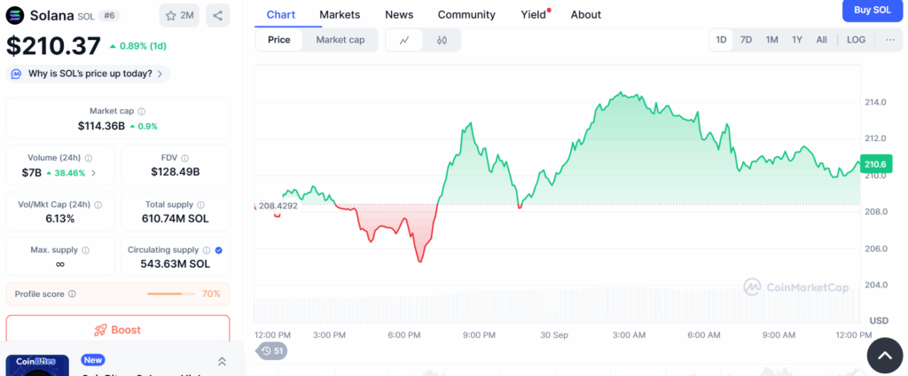 从技术面观察,SOL价格每次回调后都试图突破前高。2025年8月低点约160美元,至9月末已抬升至190美元附近,上方阻力区间则从200美元上移至250美元。当前价格回落至210.37美元。