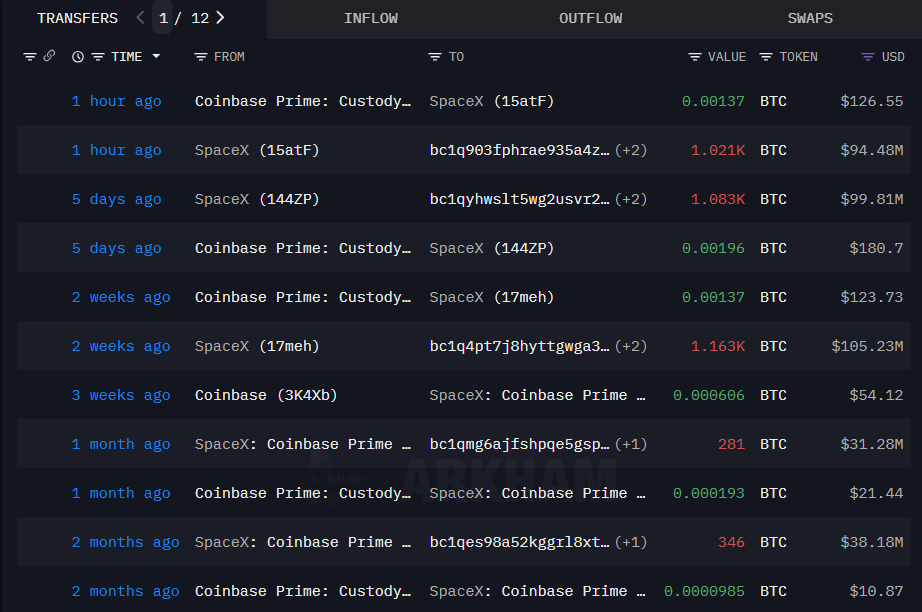 Lookonchain早前报道称,这家航天企业已将价值超过9400万美元的比特币转移至可能属于Coinbase Prime托管的钱包。Arkham Intelligence数据显示,约一小时前,SpaceX钱包地址"15atF"将1021枚比特币(转移时价值约9448万美元)转入以"bc1q903"开头的新钱包。
