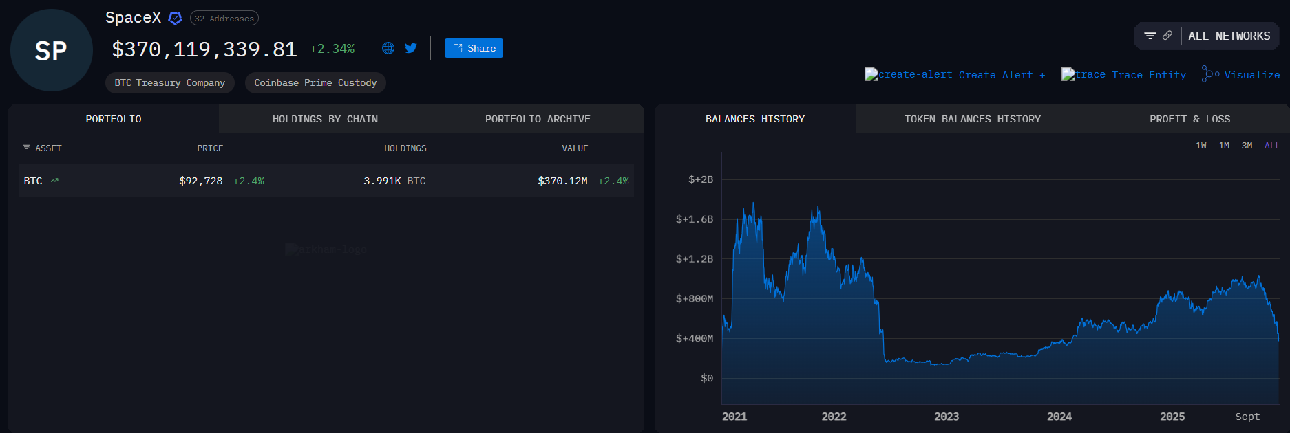 过去数月间,SpaceX持续在自有钱包与Coinbase Prime之间进行类似资金调度。截至12月10日,Arkham数据显示SpaceX持有3991枚比特币,总价值超3.7亿美元。该公司钱包内的比特币持仓量较2025年初的8300枚有所减少。