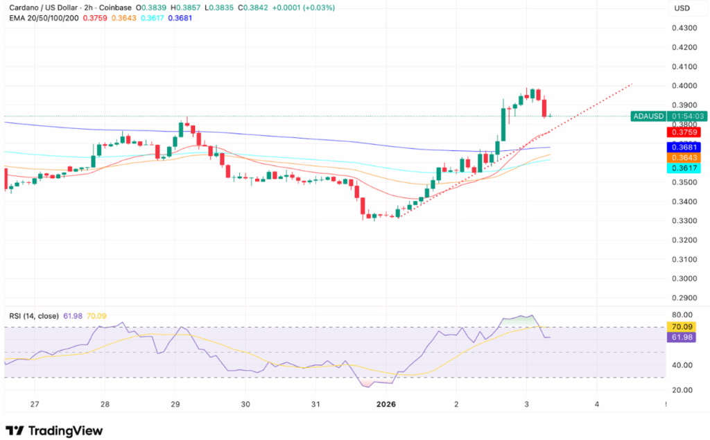 在2小时图表中,卡尔达诺虽从0.33-0.34美元区域展开急剧的日内反弹,并短暂站上关键指数移动平均线,价格先后突破20日EMA(0.3759美元)与50日EMA(0.3643美元),显示短期买盘活跃,
