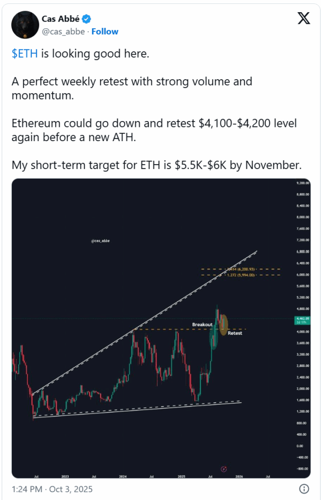 加密货币专家Cas Abbe在近期推文中表示,价格可能先回调至4200美元,随后向新高发起更强攻势。其以太坊价格预测认为当前形成"完美的周线放量回测",暗示市场或正酝酿新一轮上涨。周线图显示,以太坊在突破4000美元阻力后小幅回踩,此类回测通常能确认突破有效性,为后续上涨奠定基础。