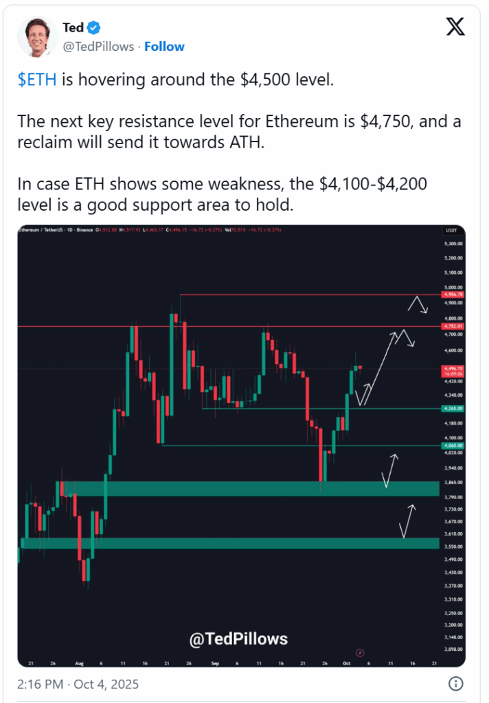 加密货币分析师Ted Pillows在以太坊价格预测中指出,后市走向取决于能否突破更高阻力位。若日线收盘站稳4500美元上方,则可能打开冲击5000美元的大门,进一步巩固看涨势头。反之若多头失守该位置,市场或回落至4200美元附近测试支撑,更深层支撑位见于3900美元。