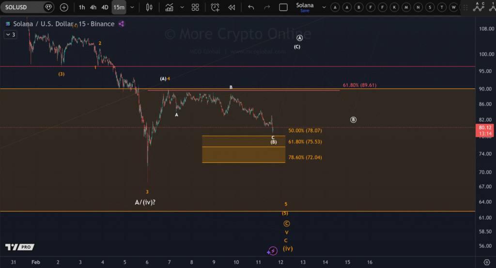 Solana(SOL)持续显露疲态,价格徘徊于80美元附近且未展现明确上行趋势。根据More Crypto Online分析,当前结构尚未确认趋势反转。图表显示Solana未能形成上行五浪结构——这是确认走强所需的技术条件。