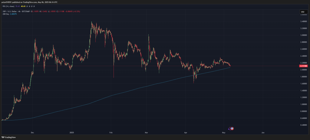 从图表来看,XRP目前正处于一个关键水平。价格略高于200日移动平均线(约2.06美元),这条线此前一直是强劲的支撑位。如果买家入场,它可能会再次发挥作用。
