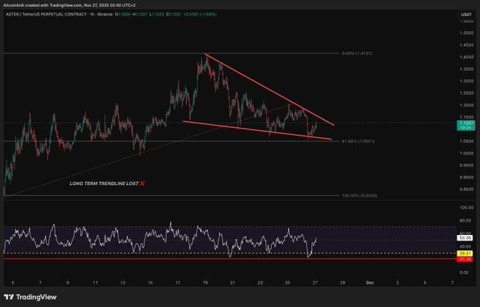价格目前遵循下降楔形边界运行,Aster维持在1.10-1.05美元区间震荡。该区域是图表上最重要的结构位,因其与1.05美元附近的61.8%斐波那契回撤位重合。只要该支撑位保持有效,当前趋势就将维持有序状态。