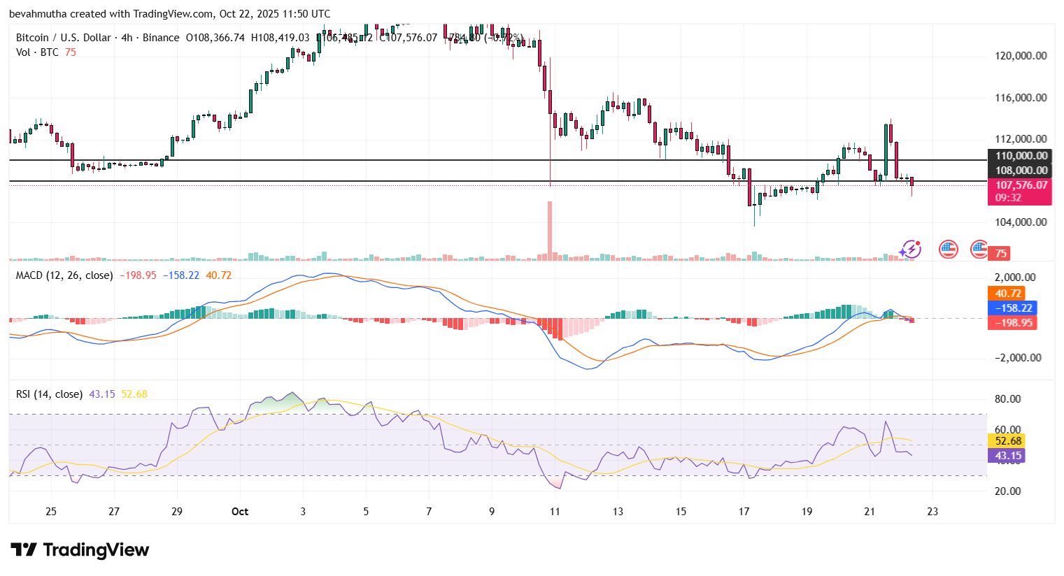比特币价格持续承压,这主要受到加密货币市场整体看跌情绪的影响。尽管该领先加密货币曾短暂测试111,000美元关口后回落,但目前仍维持在110,000美元下方。分析师指出,虽然出现下跌,但当前价格结构显示支撑位仍具韧性。过去24小时内,比特币下跌0.8%至107,725美元,反映出投资者谨慎态度和风险偏好降低。