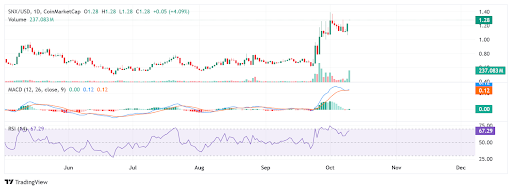 上一交易时段SNX成交额激增至2.37亿美元,突破后的高参与度通常表明市场对走势的信心。若能维持高成交量,价格或尝试测试1.40至2.00美元的下个阻力区。