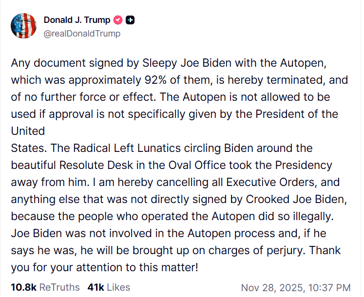 他进一步批评围绕在拜登身边的白宫激进左派试图破坏其总统职权。特朗普坚称使用自动签名机签署文件的行为违法,宣布所有非拜登亲自签署的行政命令无效,并威胁对虚假声称参与签署者提出伪证指控。