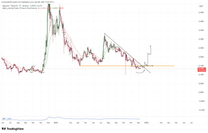 ALGO目前交易于重要高位时间框架区域附近,交易员正等待趋势线阻力位上方的突破确认。现价徘徊在0.1330美元左右,成交量下降显示卖方力量衰竭,而0.13美元支撑位依然稳固。若能重新站稳0.14美元关口,短期动能可能转向0.15-0.18美元区间。