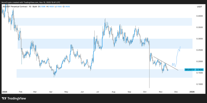 Muro的图表概述了SEI若突破趋势线后的潜在路径。突破可能启动早期扩张阶段,下一个目标区间在0.22至0.25美元之间。该区域曾作为年中交易的重要供应区,可能再次成为关键反应区。