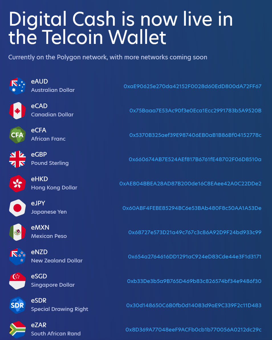 Telcoin 的数字现金代表了一类新型的多币种稳定币,旨在为下一波移动金融服务提供动力。这些稳定币——例如即将推出的 eUSD 和 eEUR——旨在革新用户与区块链系统及传统金融基础设施的交互方式。