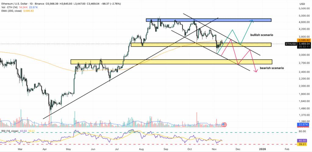 若延续当前轨迹,代币价格可能下探2700美元(较现价下跌23%),除非出现重大利好,否则空头或将占据主导。