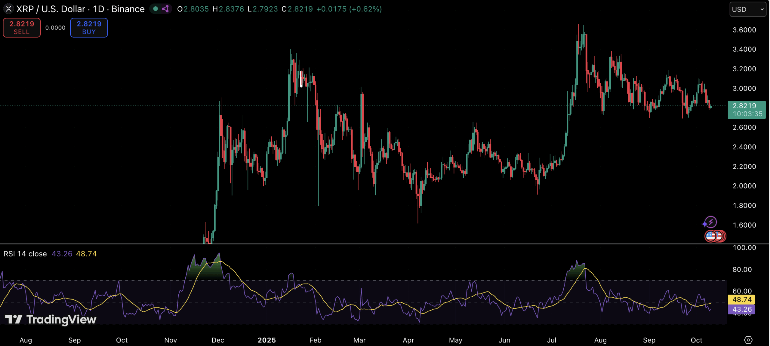 TradingView图表显示,XRP在2.82美元附近横盘整理,形成与历史突破前相似的清晰结构。长期月线图上,XRP正测试指向4美元区域的上升阻力线——该位置被视为心理关口与技术里程碑的双重考验。