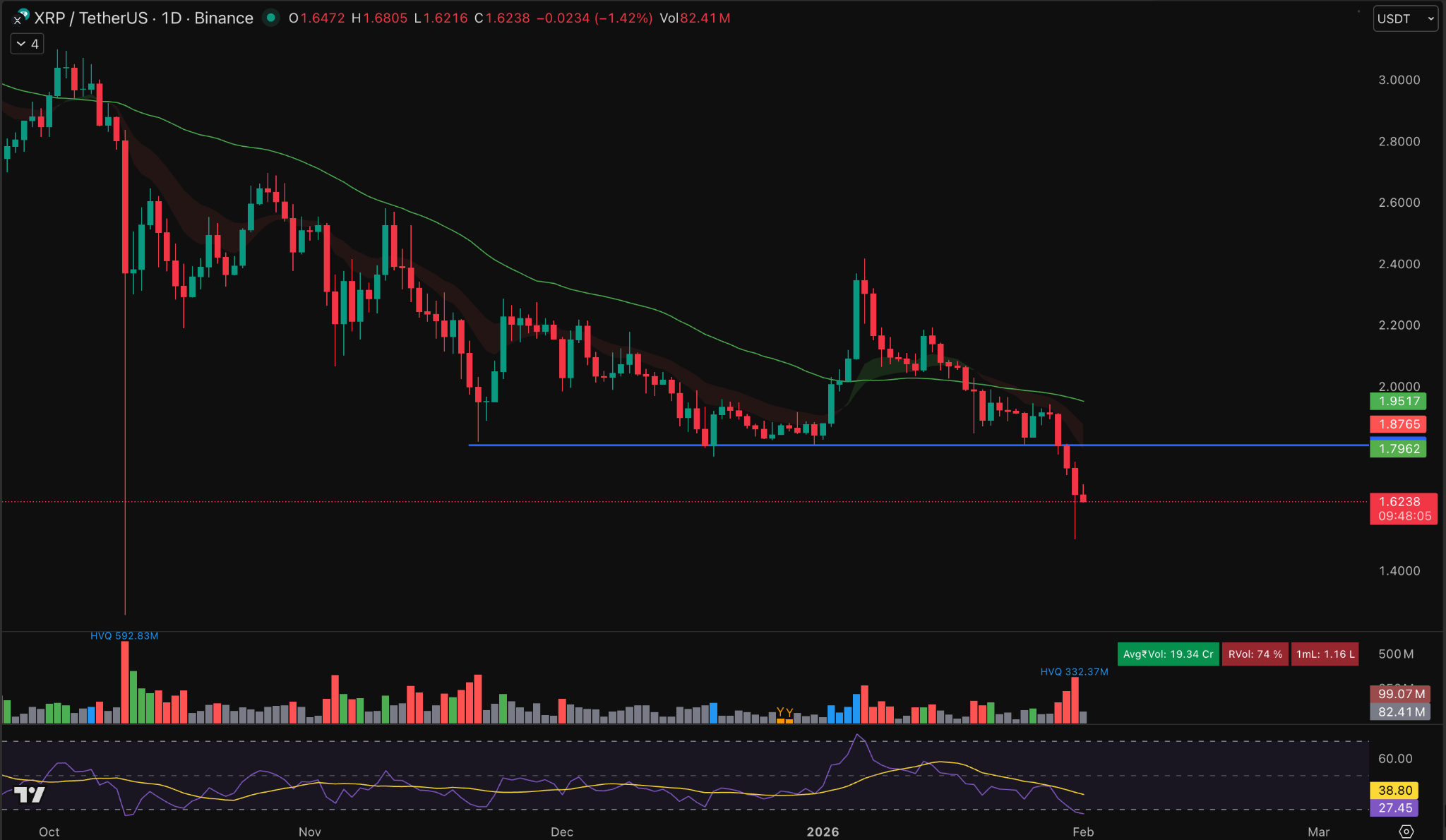 目前,瑞波币的交易价格约为1.62美元,在更广泛的加密货币市场又一轮看跌走势后延续了跌势。这一走势跌破了过去两个月在1.8美元心理关口附近形成的支撑结构。近期的价格走势表明,空头仍然牢牢掌控局面,缺乏看涨动能可能将瑞波币价格推低至1.5美元左右。