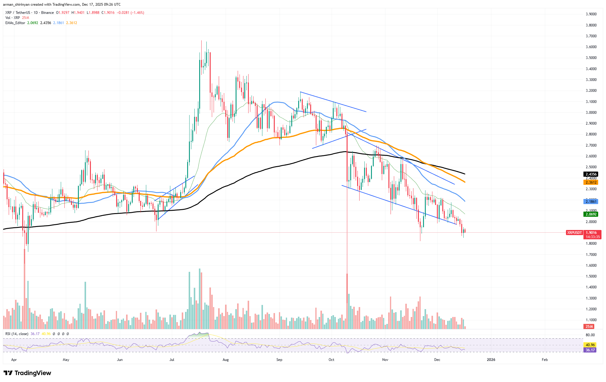 从市场角度看,XRP仍面临压力。日线图上价格持续在关键移动平均线下方运行,形成明显的高点下移与低点下移态势。当2.10-2.00美元区间的中位支撑失守后,市场动能已明显向空方倾斜。