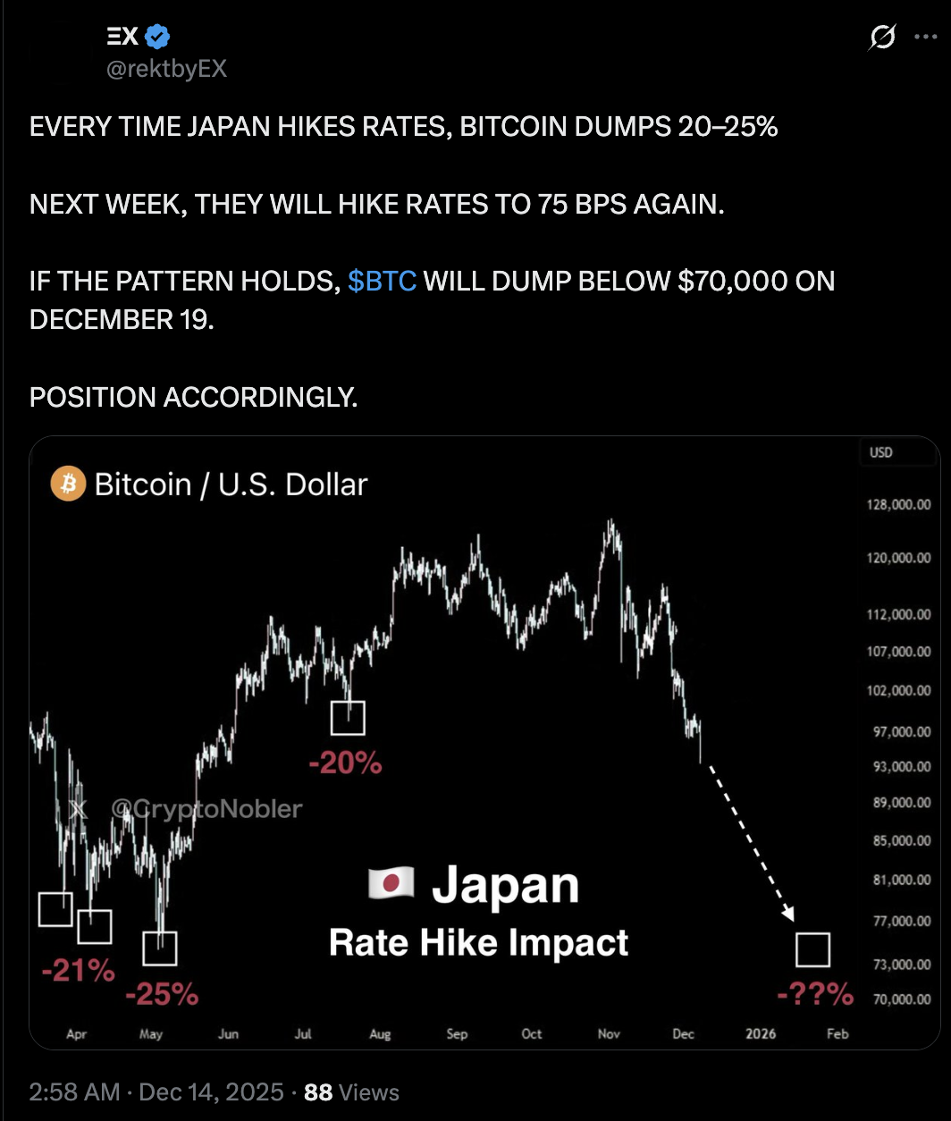 多位宏观分析师指出,若日本央行在12月19日如期加息,比特币可能继续回调至7万美元水平。
