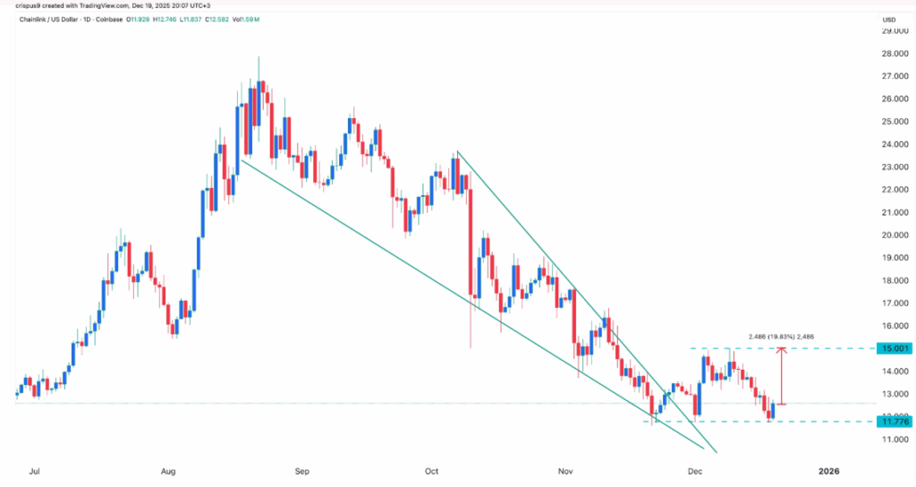图表形态显示该代币在近期下跌后可能正在构筑底部。LINK在11.77美元附近形成双底结构,同时伴随预示趋势衰竭的下降楔形形态提供支撑。尤为重要的是,价格始终保持在关键支撑位上方,使得反弹预期得以持续。