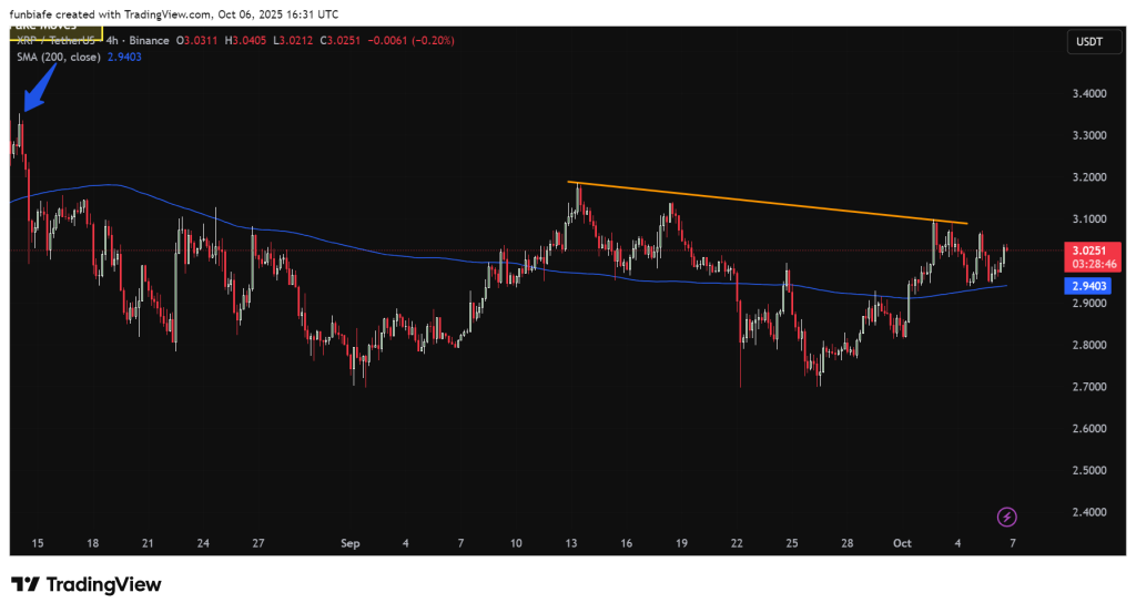 从技术面观察,XRP四小时图显示代币价格在下降三角形形态内波动,2.94美元附近的200周期均线构成强劲支撑。自九月中旬以来,XRP持续在该水平上方震荡,形成逐步降低的高点结构——这种形态通常预示着强力突破。