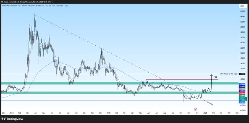 当技术图表与市场叙事形成共振时,趋势便获得强化动能。PA Koala C认为FET价格走势正在印证这一点。TradingView图表显示,经历长期下跌后价格最终趋于平缓,形成紧密的整理区间。