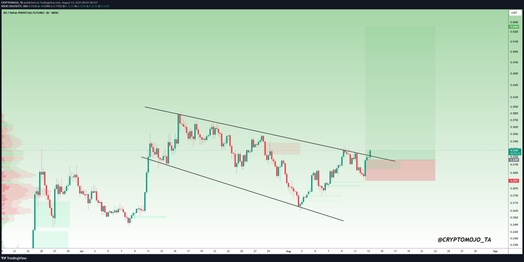 另一位化名ChartMonkey的分析师Barry分享了CRYPTOMOJO_TA的看涨分析,图表显示SEI已突破持续数周的下降通道形态。此次突破伴随着强劲动能,推动价格突破通道趋势线,进入0.32至0.33美元的关键重测区域。