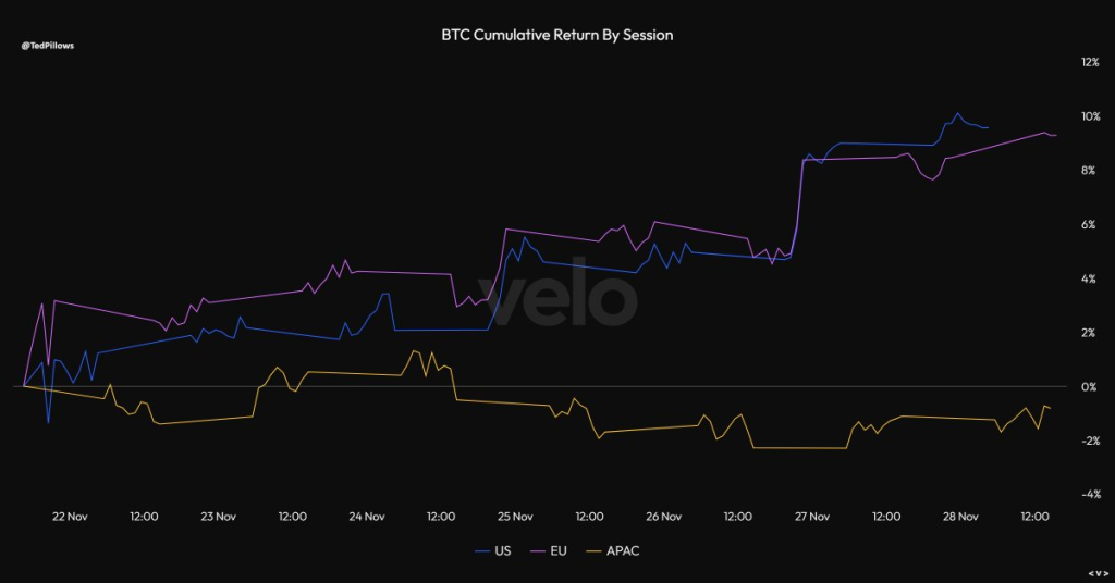 最新交易时段数据显示,本周欧美市场持续买入比特币。累计回报数据显示这两个地区在过去六天内涨幅接近10%。与之形成对比的是,亚洲市场始终处于负值区间,呈现持续净卖出态势。