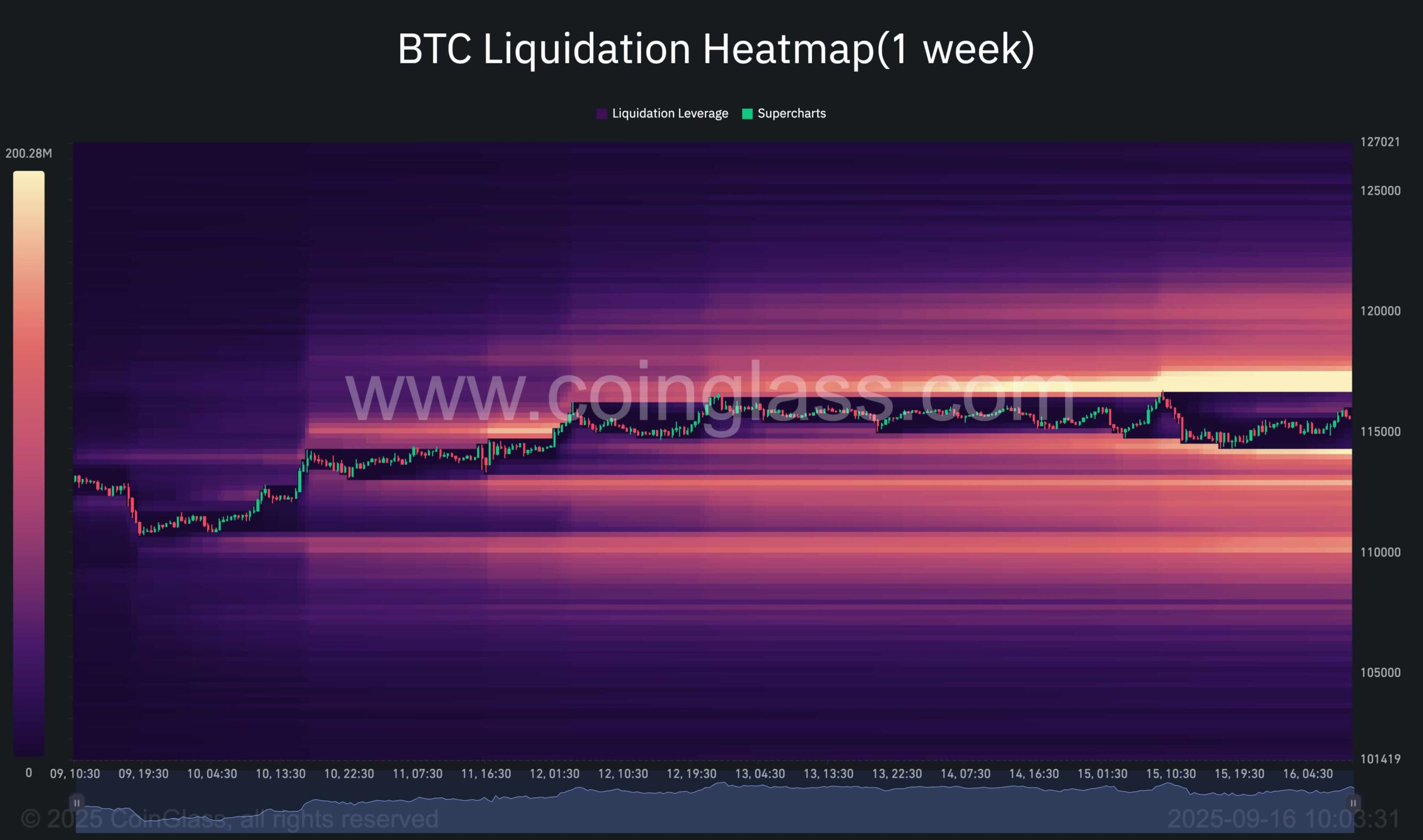 比特币周线清算热图显示,在近期摆动高点上方存在密集的清算集群,这与四小时图表讨论的流动性区域相吻合。