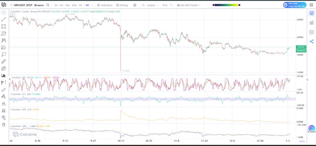 平均真实波幅(ATR)持续维持在低位,印证了XRP仍在区间内蓄势的预判。市场表现并不急躁,这通常意味着交易者正在等待明确的突破信号。在经过数周横盘后,能量潮(OBV)指标开始缓慢攀升,暗示尽管买盘尚未强势推高价格,但资金已在悄然吸纳。