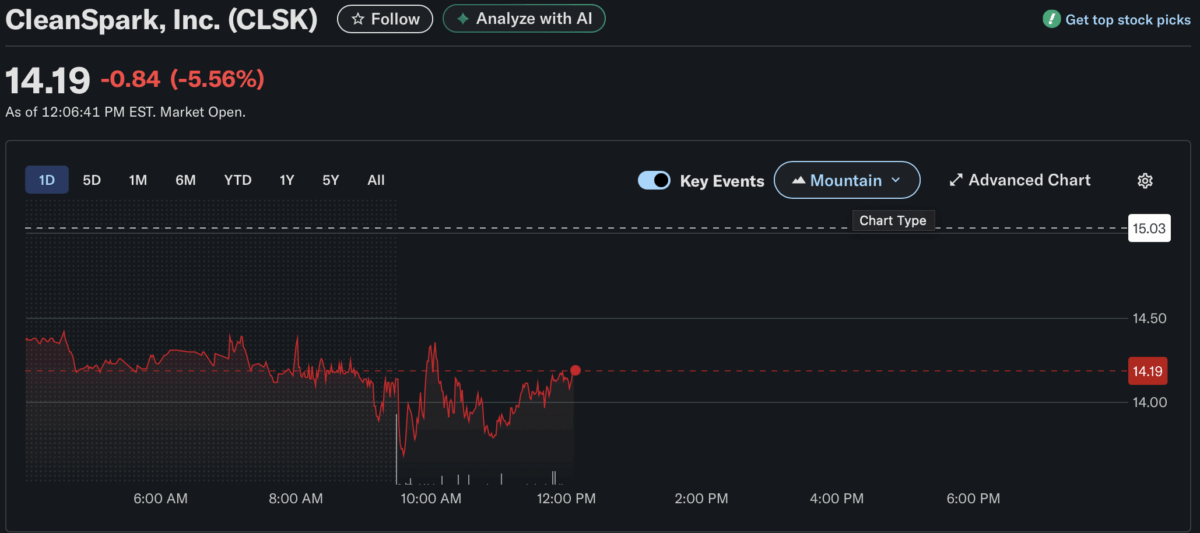 尽管业绩表现亮眼,CleanSpark股价却持续承压。截至发稿时,其股价下跌5.56%至每股14.18美元,较10月中旬22美元以上的高点回落约25%。