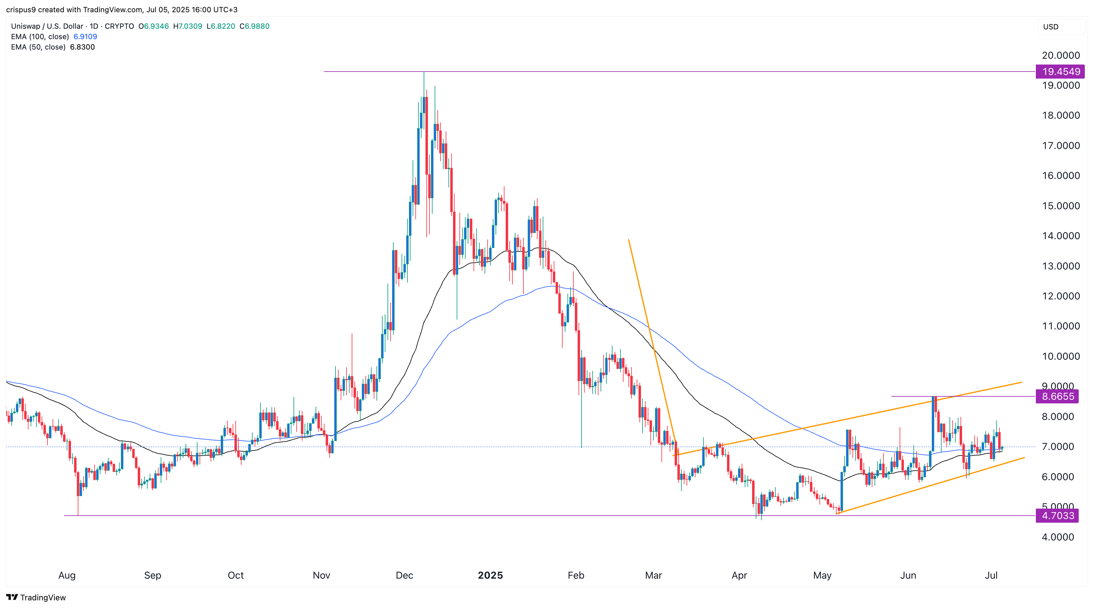 Uniswap(UNI)价格自今年5月峰值下跌超20%后,已陷入熊市泥潭。7月5日周六数据显示,UNI交易价格为6.95美元,较去年11月20美元的高点大幅缩水。其市值随之跌至48亿美元,较去年超百亿美元的峰值严重蒸发。
