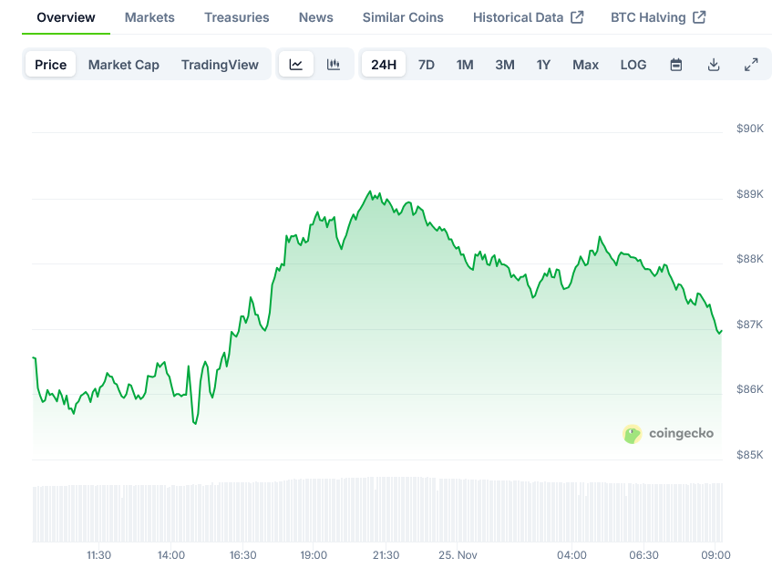 根据Brave New Coin现货交易数据,截至2025年11月24日,比特币现报86,000美元附近。此前价格多次尝试突破88,000至90,000阻力区域未果,从周末84,500美元低点反弹回升。