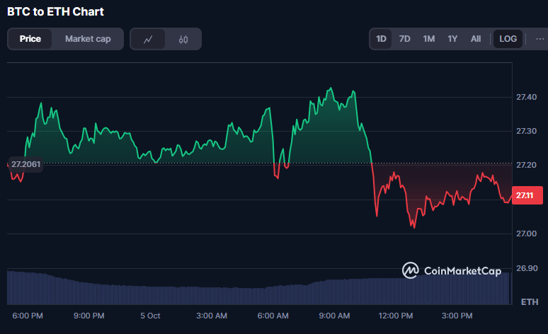BTC/ETH汇率跌至27.11,较此前27.40水平显著下降。该数据印证了比特币相对于以太坊的弱势,与资金流向多元化资产的趋势相吻合。比率的持续走低佐证了以太坊日益增强的影响力,及其成为下一阶段加密牛市主导力量的潜力。