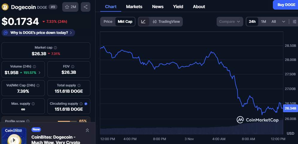 过去24小时内狗狗币价格下跌7.33%,波动加剧中现报0.1734美元,26.3亿美元的市值缩水反映出山寨币整体情绪走弱。然而19.5亿美元的日交易量增长表明,随着通胀改革、技术升级和ETF进展的讨论升温,市场参与度依然强劲。