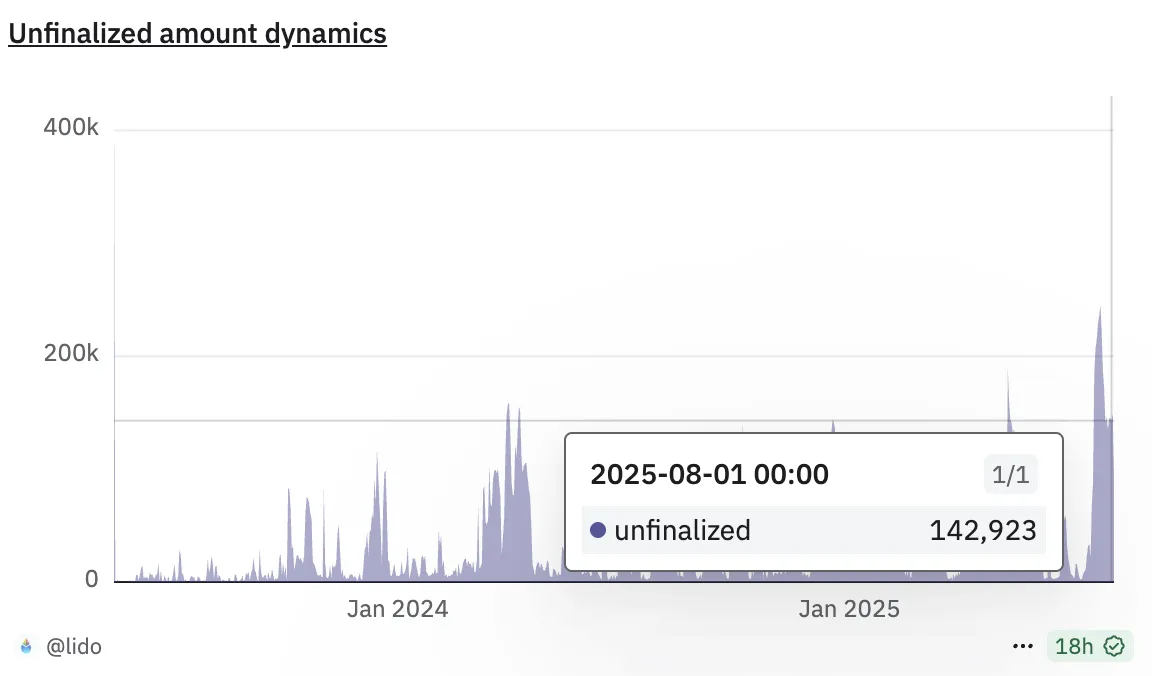 除了市场份额收缩,Lido近期披露其"双重治理"(DG)系统中RageQuit机制存在漏洞。项目组确认用户资金未受影响且已采取缓解措施,但此事提醒人们:即便是头部协议也难逃运营中的技术风险。与此同时,平台待处理提款量达到启用提款功能后的历史峰值。Dune数据显示待提ETH接近14.3万枚,虽较峰值有所回落,但随着更灵活安全的质押方案涌现,部分用户的信心已出现转变。
