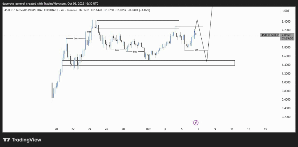 尽管上市初期$ASTER呈现上涨态势,但分析师普遍警示市场可能出现调整。知名分析师Crypto General分享的图表显示,在形成更强劲的上升趋势前,代币价格或将经历显著回落。这主要源于即将到来的4%代币解锁事件带来的抛压。