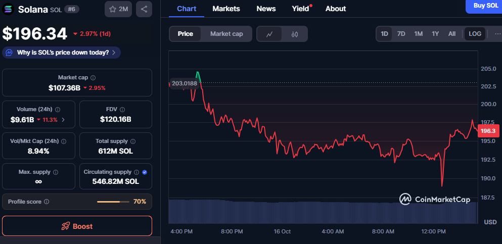 Solana在突破200美元关口后迎来短期盘整,当前2.97%的跌幅表明交易活动趋于平静。买方持续守护190-195美元区间,尽管主流加密货币普遍出现获利回吐和市场疲软,该支撑位仍显示出稳定性。