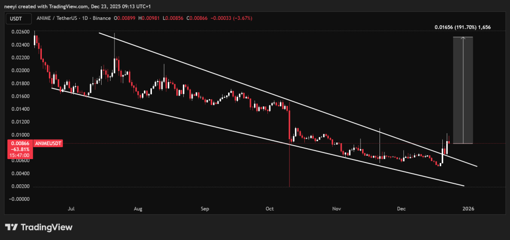 近期,尽管其他加密货币价格走势挣扎,但Animecoin(ANIME)的表现却令人瞩目。该代币在过去三天内价格涨幅超过60%。从图表上可以快速看出,价格已突破长达数月的下降通道。这一突破发生在三天前,单日涨幅高达40%。次日,价格成功将已突破的阻力位测试为新的支撑位。