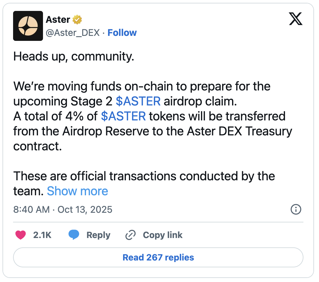 Aster团队宣布将原定10月14日进行的第二阶段空投推迟至10月20日,官方解释为分发系统出现技术故障,并确认总供应量4%的代币将转入国库合约。但分析师警告,将超半数代币预留作未来空投的做法可能引发市场稀释风险。
