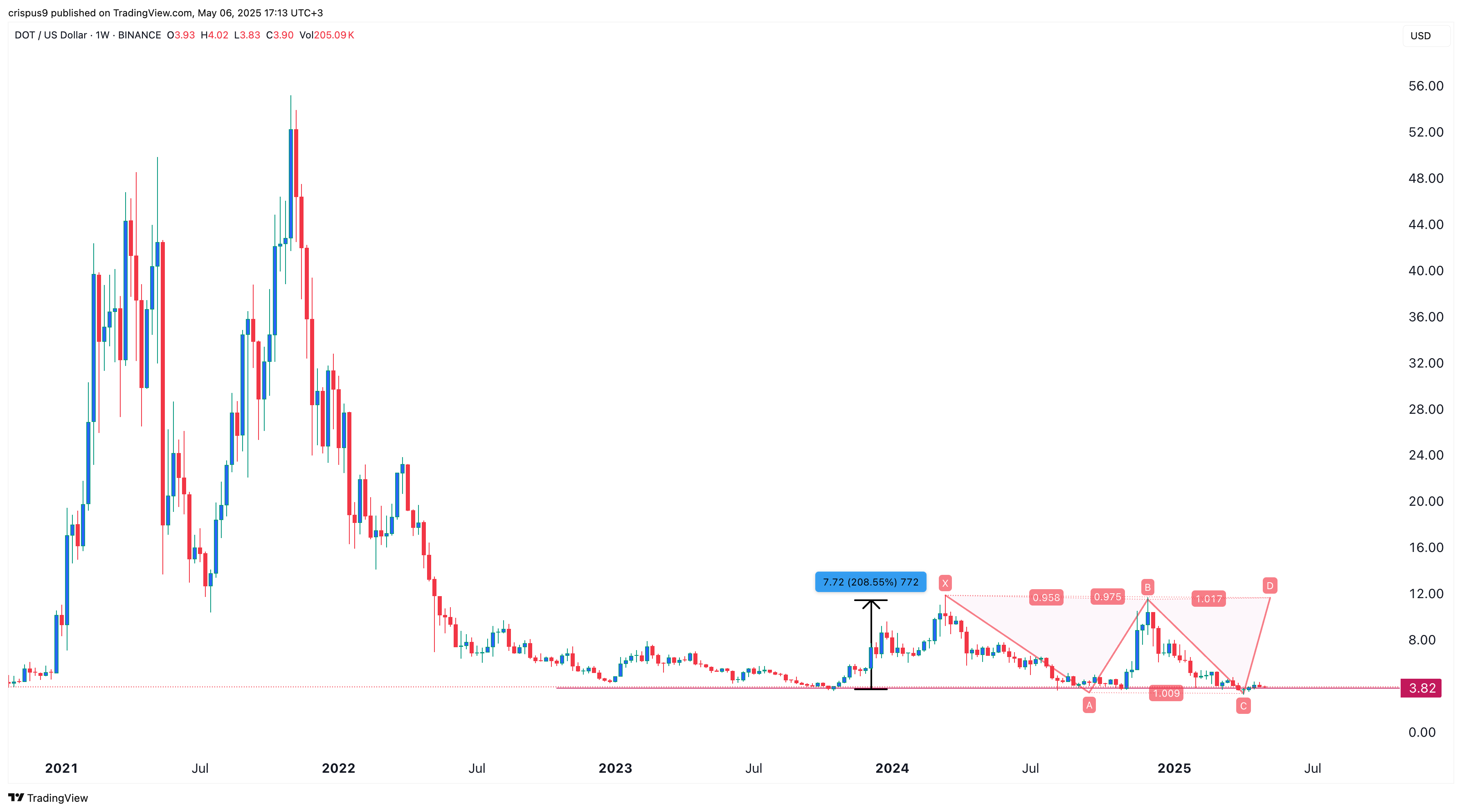 DOT还形成了谐波XABCD模式,现在正开始最后的CD波。如果这种模式成立,该代币可能会反弹并重新测试12美元的关键阻力点,比当前水平上涨近200%。