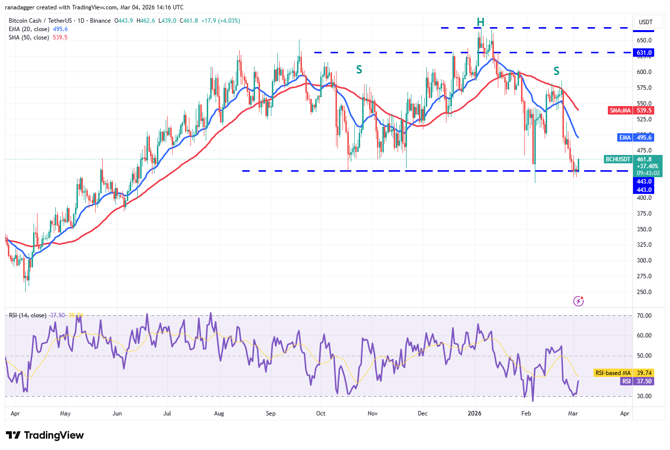 多头正试图开启一轮反弹行情,但很可能在 20 日 EMA(495 美元)处遭遇卖压。如果比特币现金价格从 20 日 EMA 大幅回落,则会增加跌破 443 美元支撑位的风险。如果发生,BCH/USDT 交易对将完成一个看跌的头肩顶形态,从而开启跌向 375 美元的走势。