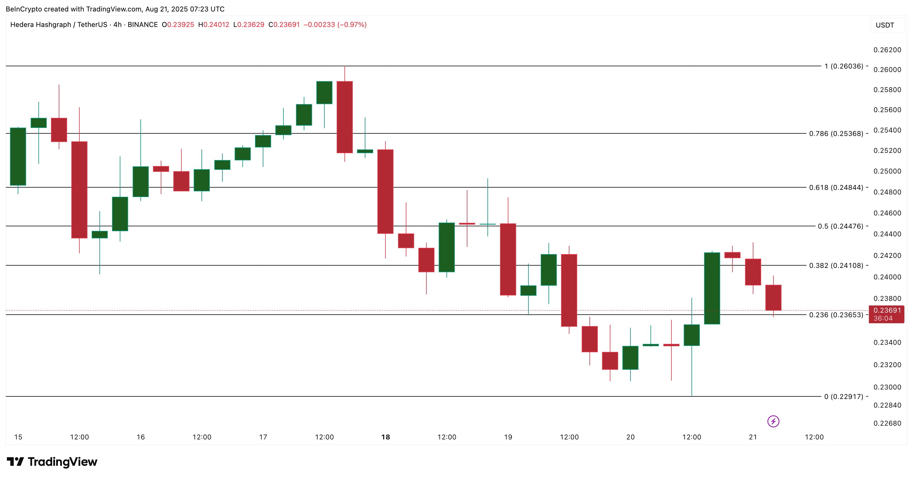 4小时图上,HBAR价格正徘徊于0.236美元至0.241美元的狭窄区间。该代币屡次尝试站稳该区域上方未果。