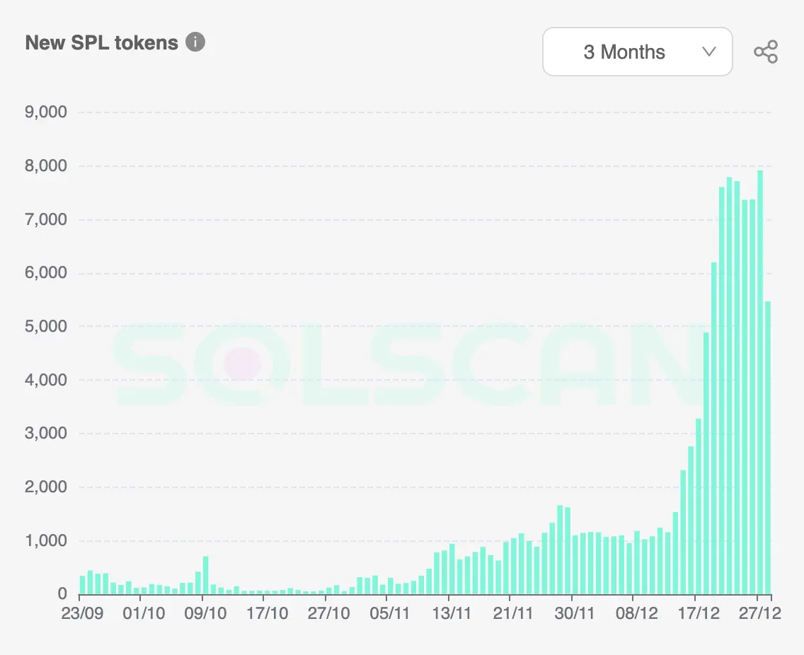 自2020年Solana推出以来,其每日新代币创建统计数据现在持续高于以往任何时期,大约是其历史最高水平的四倍。虽然Solana生态系统在过去的两个月里经历了显著的复苏——这推动了SOL、Solana NFT、Solana meme币甚至对Solana智能手机的需求——但代币创建的急剧增长很可能无法仅仅通过网络活动的自然增长来解释。