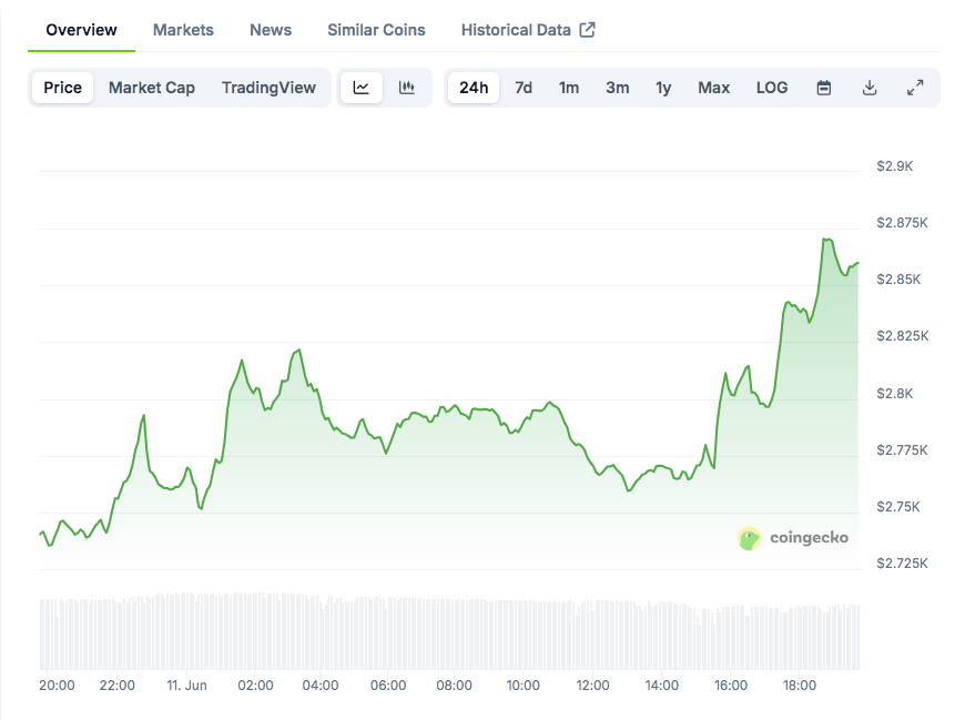 ETH价格测试2800美元阻力位,动能放缓且交易量收缩